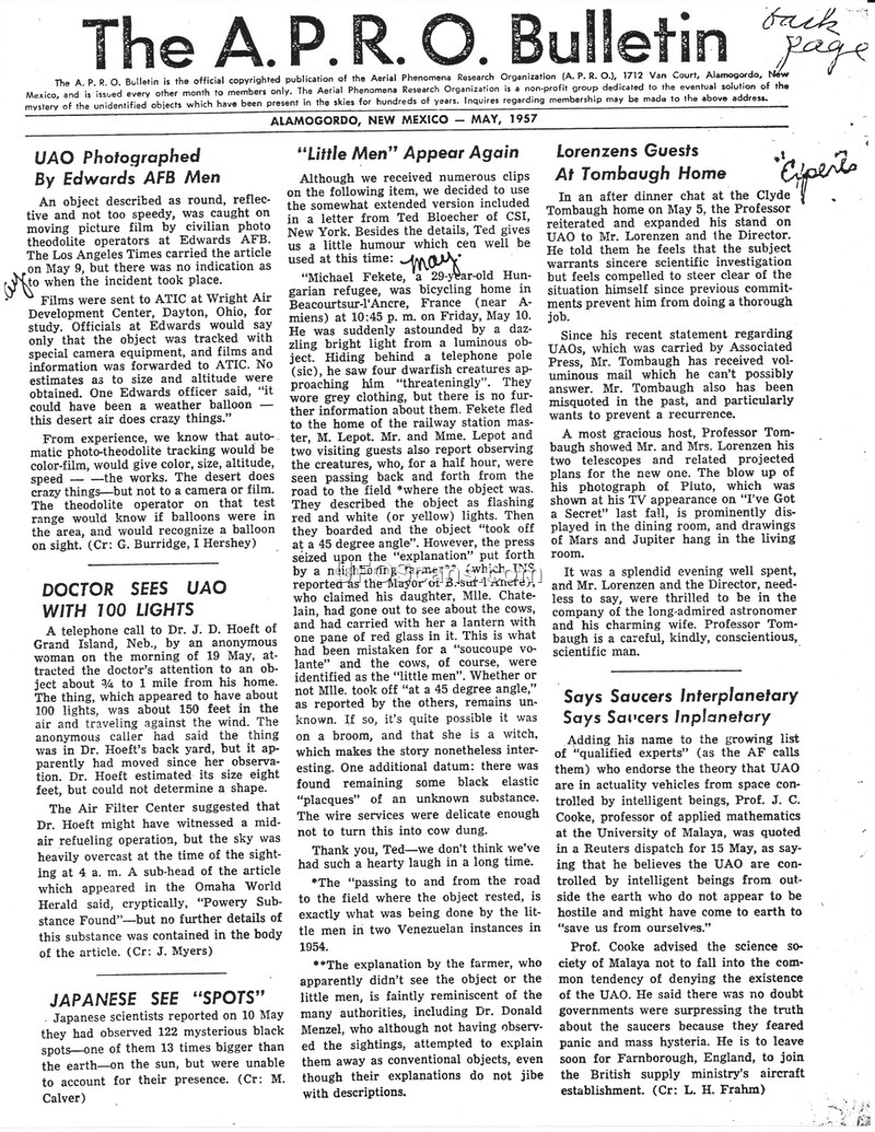The May 1957 issue of The A.P.R.O. Bulletin serves as a compilation of reports, editorials, and book reviews concerning Unidentified Aerial Phenomena (UAO). The document details various sightings, including an object filmed by civilian photo-theodolite operators at Edwards Air Force Base, a sighting by Dr. J. D. Hoeft in Grand Island, Nebraska, and a report of 'little men' in Beacourt-sur-l'Ancre, France. The bulletin emphasizes the organization's commitment to serious scientific investigation, distinguishing its approach from 'contact cults' and those who accept saucer claims without evidence. It features an editorial on the financial status of APRO and the necessity of increasing membership dues. The bulletin also highlights the activities of its Director, Coral E. Lorenzen, including a lecture at the Unitarian Fellowship of Alamogordo. Significant attention is given to the scientific community's stance on UAO, citing figures like Professor J. C. Cooke and astronomer Clyde Tombaugh. The document also covers the controversy between NICAP Director Donald Keyhoe and Dr. Hugh L. Dryden regarding the existence of flying saucers. Additionally, it includes technical discussions on a proposed 'new propellant' by Gaston Burridge and reviews of books by M. K. Jessup, Max Miller, and Israel Norkin. The bulletin concludes with a section on 'Recent Sightings' from across the United States, South America, Europe, and Asia, reflecting the global nature of the phenomenon as perceived by the organization.