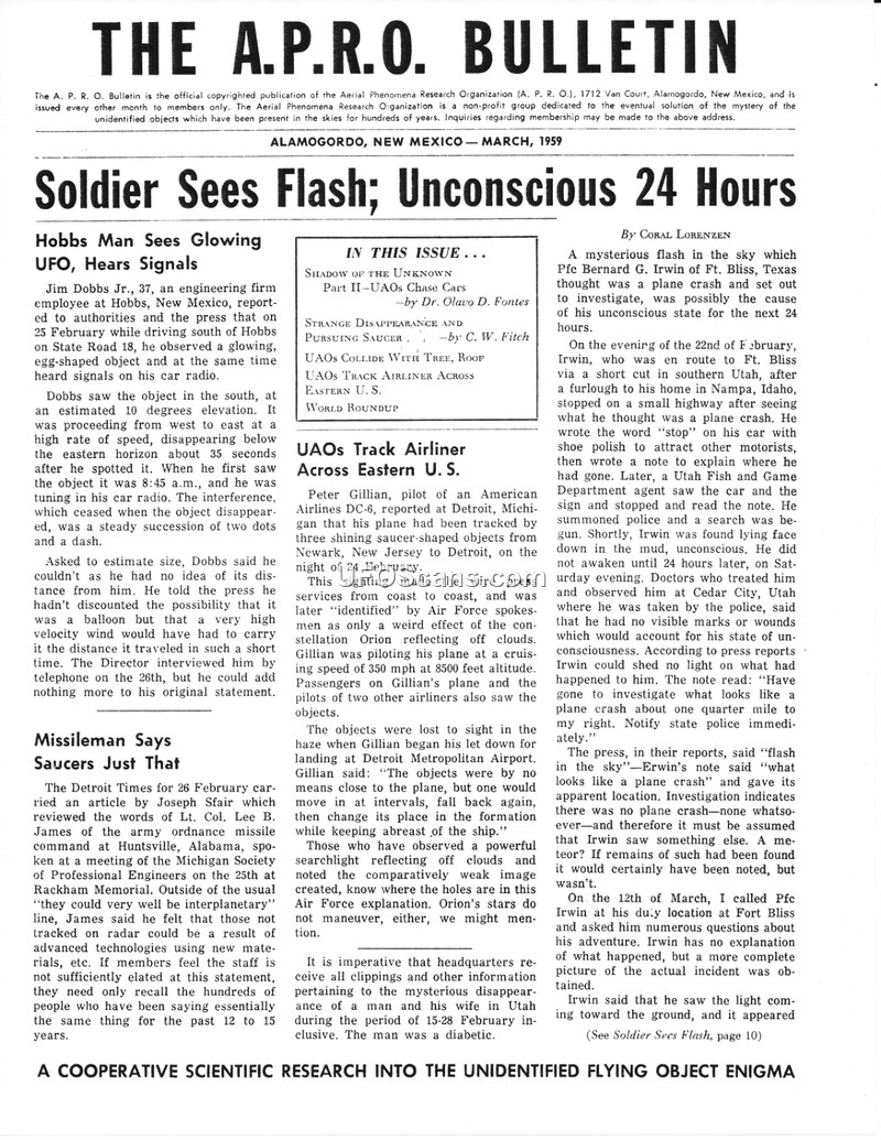 The March 1959 issue of The A.P.R.O. Bulletin, published by the Aerial Phenomena Research Organization, serves as a compilation of reports and analysis regarding Unidentified Aerial Phenomena (UAP). The document details several specific sighting incidents, including a report by Jim Dobbs Jr. in Hobbs, New Mexico, involving a glowing, egg-shaped object and radio interference. Another significant report concerns Pfc Bernard G. Irwin, who experienced a 24-hour period of unconsciousness in Utah after investigating what he believed to be a plane crash. The bulletin also covers a sighting by American Airlines pilot Peter Gillian, who reported being tracked by three saucer-shaped objects between New Jersey and Detroit, an event the Air Force attributed to the reflection of the constellation Orion. A major feature of this issue is the second part of a series by Dr. Olavo D. Fontes titled 'Shadow of the Unknown,' which documents a series of incidents near Ponta Poran, Brazil, where UAPs reportedly chased vehicles and demonstrated intelligent, coordinated behavior. The bulletin also discusses the mysterious disappearances of several families in the United States, suggesting a potential, though unproven, link to UAP activity. Throughout the publication, the editor, Coral E. Lorenzen, emphasizes the need for scientific rigor in investigating these phenomena and criticizes the U.S. Air Force's handling of pilot reports, noting that many pilots feel discouraged from reporting sightings due to fear of ridicule or professional repercussions. The document concludes with a 'World Roundup' section, summarizing international sightings, including reports from England and Greece, and reiterates the organization's commitment to solving the mystery of unidentified objects.