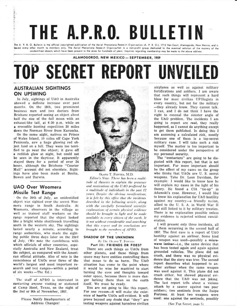 This bulletin from September 1959 compiles global UAO sighting reports and presents a theory by Dr. Olavo T. Fontes that UAOs are using microwave and ultrasonic weapons against humans and aircraft. It serves as an advocacy document for the Aerial Phenomena Research Organization, challenging official government silence on the subject.