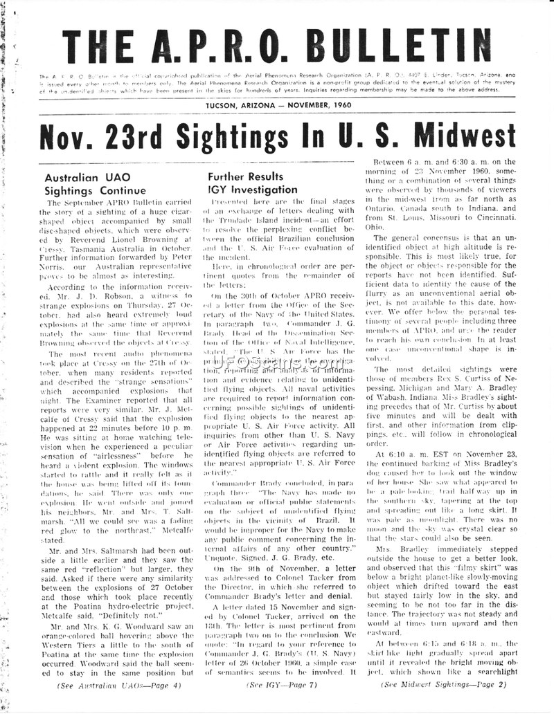 The November 1960 issue of The A.P.R.O. Bulletin provides a comprehensive overview of UAP sightings and related government correspondence. The primary focus is a series of sightings occurring on the morning of November 23, 1960, across the U.S. Midwest, where thousands of witnesses reported objects at high altitudes. These reports, including detailed accounts from Rex S. Curtiss and Mary A. Bradley, describe cigar-shaped and disc-shaped objects with trail-like skirts, often accompanied by light-emitting features. Official explanations, such as weather balloons, rocket stages, or radar chaff, are heavily scrutinized and largely dismissed by APRO as inadequate to explain the observed maneuvers and physical characteristics of the objects. The bulletin also features the third part of Dr. Olavo Fontes' series on 'Orthoteny in Brazil,' which analyzes a network of alignments of UAP sightings in the Brazilian Northeast. Fontes suggests these alignments indicate a systematic, long-term reconnaissance program by extraterrestrial craft, potentially targeting strategic communication and infrastructure centers. The document further details ongoing correspondence between APRO and the U.S. Navy and Air Force regarding the IGY (International Geophysical Year) photos, highlighting a perceived pattern of government censorship and the dismissal of UAP reports as 'publicity stunts' or 'hoaxes.' The editorial section reiterates APRO's commitment to objective investigation, despite the challenges posed by official secrecy and the stigma associated with UAP research. The bulletin concludes with a call for members to continue reporting sightings and to remain vigilant, emphasizing that the truth regarding UAP must be told to prepare the public for potential future encounters.