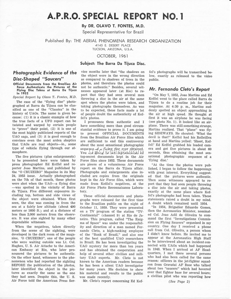 This special report, published by the Aerial Phenomena Research Organization (A.P.R.O.) in October 1961, details the investigation into the 'Barra da Tijuca Disc' sighting that occurred on May 7, 1952, in Brazil. The report, authored by Dr. Olavo T. Fontes, M.D., presents the case as a 'classic' in UAO (Unidentified Aerial Object) history. The sighting involved press photographer Ed Keffel and reporter Joao Martins, who captured five photographs of a disc-shaped object while working for 'O CRUZEIRO' magazine. The report asserts that the Brazilian Air Force conducted a rigorous scientific investigation into the incident, including the use of photogrammetry and analysis of the negatives, and ultimately concluded that the photographs were authentic. Dr. Fontes addresses and refutes claims that the incident was a hoax involving a thrown wooden disc, noting that the Brazilian Air Force itself attempted to reproduce the photographs using such a model but failed to achieve the same results. The report includes detailed diagrams and analysis of the object's flight path, altitude, and distance, as well as a discussion regarding the U.S. Air Force's public dismissal of the photos based on shadow analysis, which Fontes attributes to a misunderstanding of the specific environmental conditions at the site. The document serves as a compilation of evidence, including reports from researcher Fernando Cleto and official Brazilian Air Force documentation, to argue that the Barra da Tijuca incident provides absolute photographic evidence of intelligently controlled aerial vehicles.
