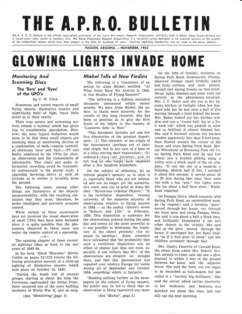 The November 1962 issue of The A.P.R.O. Bulletin serves as a compilation of reports, translations, and analysis regarding Unidentified Aerial Phenomena (UAP). The document features a translation of an article by Aime Michel, which discusses the 'orthotenic' lines of UFO sightings and a proposed 26-month periodicity in global sighting waves, which the author links to the orbital approach of Mars. The bulletin also includes detailed accounts of historical and contemporary sightings, such as the 1943 'foo-fighter' incidents during World War II, the 1948 George Gorman 'dogfight' over Fargo, and a 1962 sighting in Jacksonville, Florida, where residents reported fireballs causing electrical interference. The publication emphasizes the organization's belief that these objects are under intelligent control and are likely extraterrestrial in origin. It also addresses the 'humanoid' occupant reports, suggesting a possible recruitment of lower species by extraterrestrial visitors. The document concludes with a call for continued research and a promise of future cross-indexing of 1962 sighting data.
