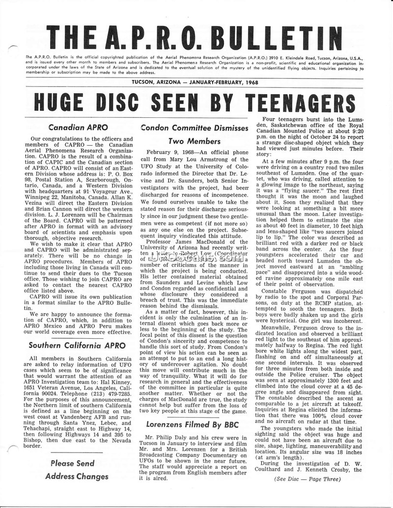 This issue of the A.P.R.O. Bulletin, dated January-February 1968, serves as a compilation of UFO sighting reports, organizational updates, and commentary on the Condon Committee. The bulletin announces the formation of CAPRO (Canadian Aerial Phenomena Research Organization) and provides detailed accounts of various sightings across Canada, including a notable incident in Lumsden, Saskatchewan, where four teenagers reported a disc-shaped object. The document also covers the dismissal of Dr. Levine and Dr. Saunders from the University of Colorado's UFO study, which the A.P.R.O. editors criticize as an act of incompetence. Additionally, the bulletin features a letter from Dr. J. Allen Hynek denying statements attributed to him by NICAP regarding his stance on the Condon Committee. Other sections include reports of sightings in Brazil, Oregon, and Alabama, as well as discussions on the philosophy of science as it pertains to the UFO phenomenon, with contributions from K. Gosta Rehn. The bulletin emphasizes the organization's commitment to objective research and its ongoing efforts to document and analyze UAP reports globally.