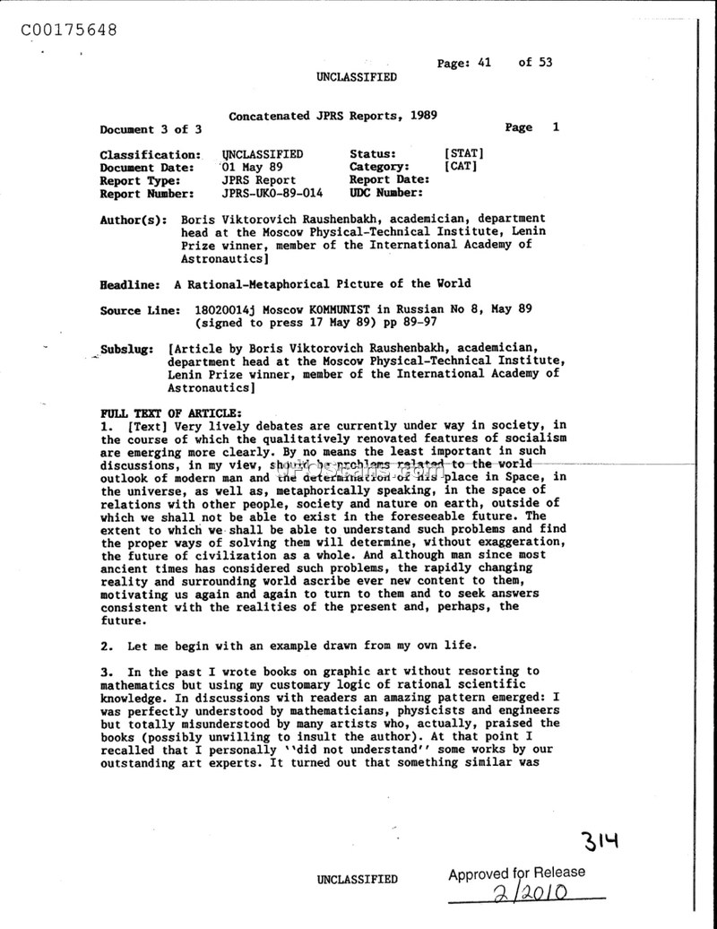 This 1989 JPRS report by Boris Raushenbakh discusses the necessity of balancing rational scientific thought with metaphorical and moral perception. It notes that individuals lacking spiritual outlets may turn to mysticism or 'flying saucers' as surrogates for deeper emotional needs.