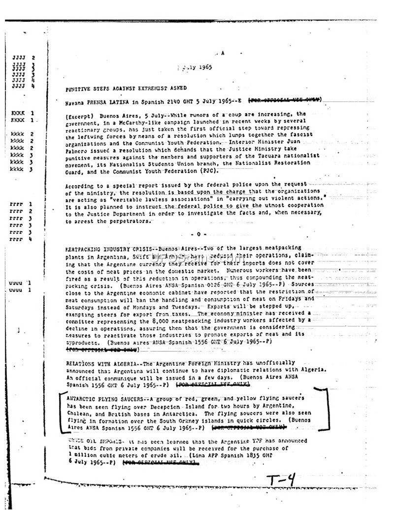 This document is a July 1965 press summary covering Argentine political unrest, meatpacking industry economic issues, and a report of flying saucers observed over Antarctic bases.