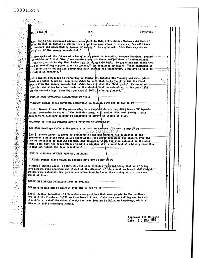 This document is a press compilation dated 15 May 1978, detailing various news items from Argentina. The report covers updates on nuclear power plant developments, including statements by Castro Madero regarding the Atucha II project and a heavy water plant in Arroyito. It also notes the upcoming visit of Bolivian Army Commander Alfonso Villalpando to Buenos Aires and a petition submitted by relatives of missing persons. A significant portion of the report addresses an aerial incident occurring on 6 May 1978. Witnesses in the northern zone of Salta Province reported seeing an object resembling a soccer ball falling behind mountains, which resulted in an explosion that shook the earth. While some reports from San Luis and Mendoza mentioned a 'flying saucer squadron' flying in formation, official sources in Salta stated that the object was an artificial satellite that had been located on Taire Mountain on the Argentine-Bolivian border. The area was subsequently declared an emergency zone by the Bolivian government. Additionally, the document covers financial news, specifically a $250-million credit agreement signed by YPF president Raul Ondarts, and various administrative briefs regarding firearm restrictions, telecommunications upgrades, and microwave link broadcasts.