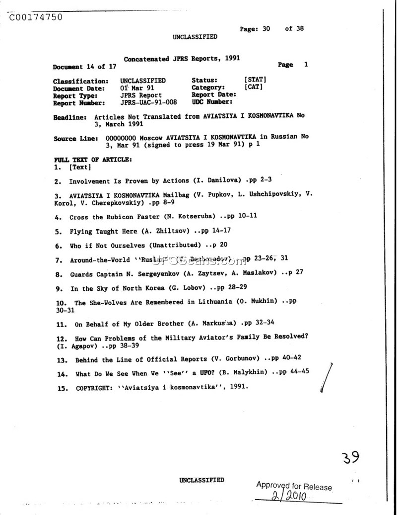 This document is a JPRS report index from 1991 listing the contents of the Soviet journal 'Aviatsiya i kosmonavtika'. It is notable for referencing an article regarding UFO sightings.
