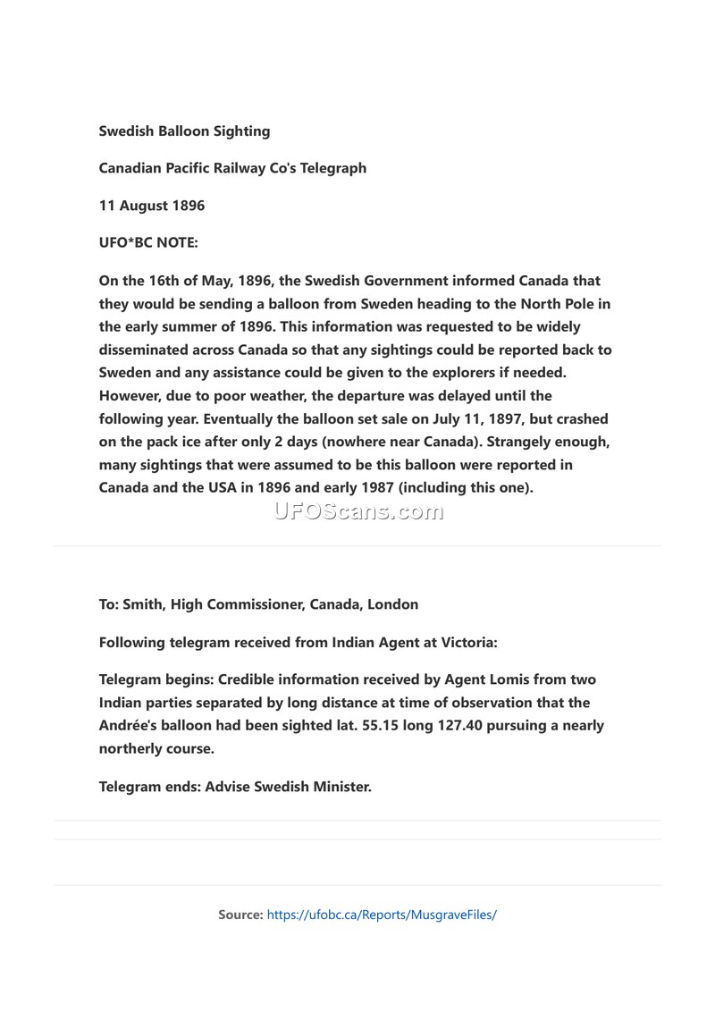 A 1896 telegraph reports a sighting of the Andrée balloon at coordinates 55.15, 127.40 in Canada. The sighting was later determined to be a misidentification, as the actual balloon did not launch until 1897.