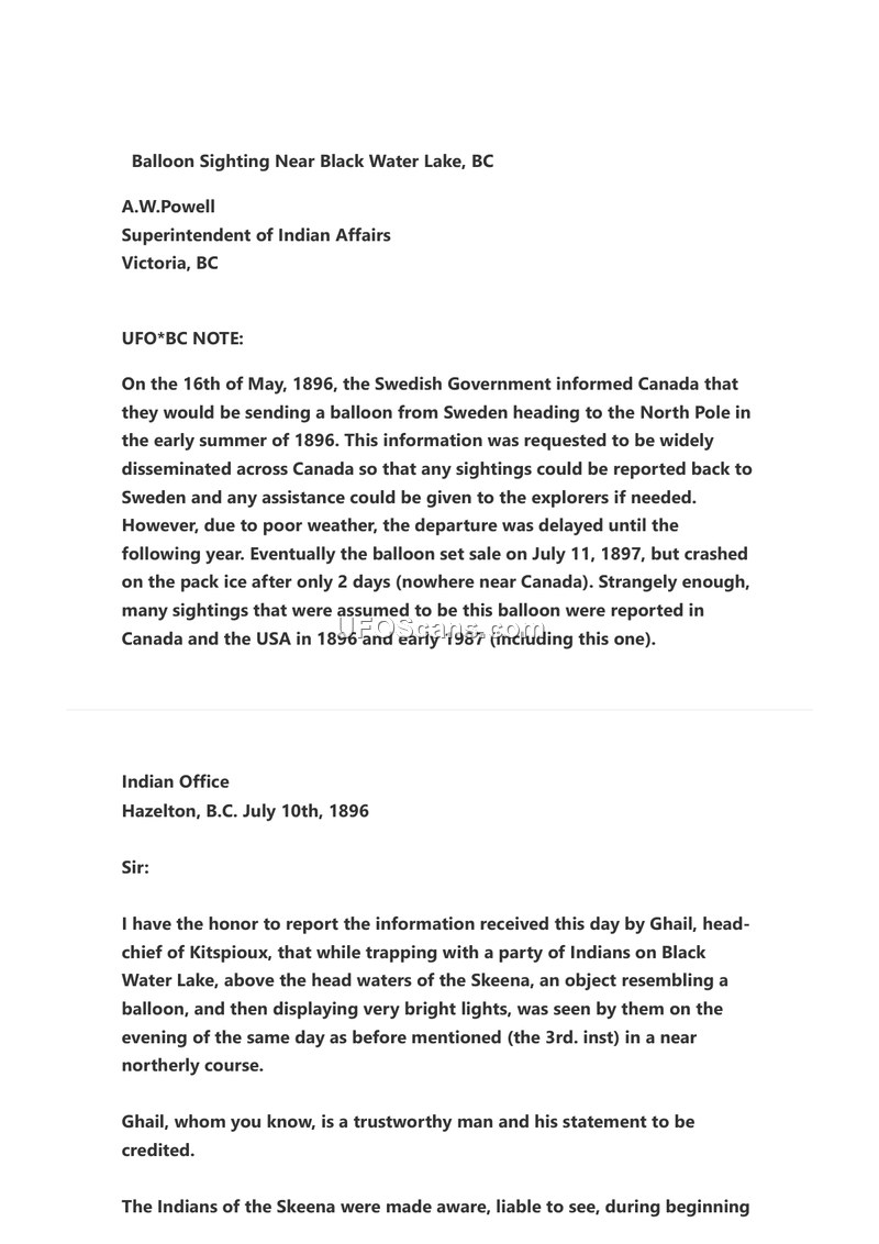 This document consists of a report from the Indian Office in Hazelton, British Columbia, dated July 10, 1896, addressed to the Superintendent of Indian Affairs, A.W. Powell. The report details an account provided by Ghail, the head chief of the Kitspioux, regarding an aerial sighting. According to the report, Ghail and a party of individuals were trapping at Black Water Lake, located above the headwaters of the Skeena River, on the evening of July 3, 1896. They observed an object that resembled a balloon and displayed very bright lights, moving in a near-northerly direction. The author of the report, Indian Agent R.E. Loring, explicitly notes that Ghail is a trustworthy individual whose statement should be credited. The document also includes a note from 'UFO*BC' providing historical context regarding a Swedish balloon expedition intended for the North Pole. This note explains that while the Swedish government had informed Canada of their intent to launch a balloon in 1896, the launch was delayed until July 1897 due to weather, and the balloon ultimately crashed on pack ice far from Canada. The note suggests that many sightings reported in Canada and the USA during 1896 and 1987 were likely misidentifications of this intended expedition.