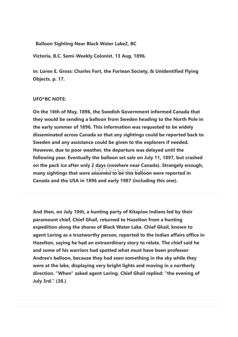 This document details a historical report of an aerial sighting near Black Water Lake, British Columbia, in July 1896. The account originates from a report in the Victoria, B.C. Semi-Weekly Colonist dated August 13, 1896, and is referenced in the work of Loren E. Gross. The core of the report concerns a hunting party of Kitapiox Indians, led by their paramount chief, Chief Ghail. Upon returning to Hazelton from a hunting expedition, Chief Ghail reported to the local Indian affairs office that he and his warriors had observed an object in the sky on the evening of July 3, 1896. The object was described as displaying very bright lights and moving in a northerly direction. The witnesses believed the object to be a balloon associated with a Swedish expedition to the North Pole, which had been publicized as being sent in the summer of 1896. A note provided by UFO*BC clarifies that while the Swedish government had indeed announced plans for such a balloon, the actual departure was delayed until July 1897, at which point it crashed on pack ice far from Canada. The note suggests that many sightings in Canada and the United States during 1896 were erroneously attributed to this specific Swedish balloon project.