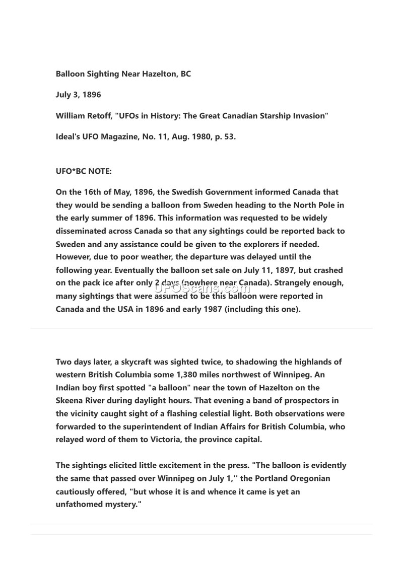A 1980 magazine article recounts a 1896 sighting of a 'skycraft' near Hazelton, BC, noting that such reports were often misidentified as a Swedish balloon expedition that did not launch until 1897.