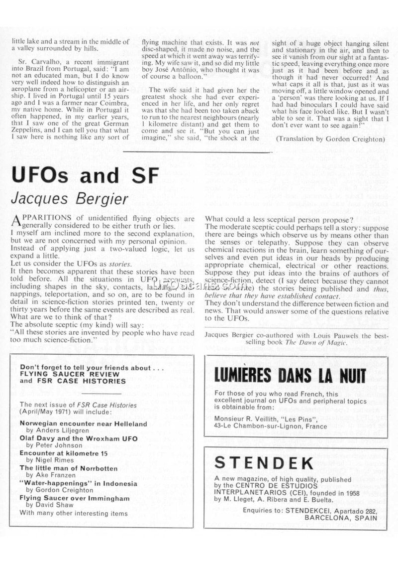 This document, authored by Jacques Bergier, explores the intersection of UFO phenomena and science fiction. Bergier discusses the skepticism surrounding UFO reports, noting that some critics dismiss all such accounts as being influenced by science fiction literature. He presents a counter-argument, suggesting that skeptics might consider the possibility of external beings observing humanity through non-traditional means, such as telepathy or chemical manipulation, which could influence human thoughts and lead to the creation of science fiction stories. The document includes a translated account from a Portuguese immigrant in Brazil, Sr. Carvalho, who describes a sighting of a silent, disc-shaped object. Carvalho recounts that the object hovered, a window opened, and a 'person' appeared to be looking out before the object vanished. The document also serves as a promotional compilation for various UFO-related publications, including 'FSR Case Histories', the French journal 'Lumieres Dans La Nuit', and the Spanish journal 'Stendek', published by the Centro de Estudios Interplanetarios.
