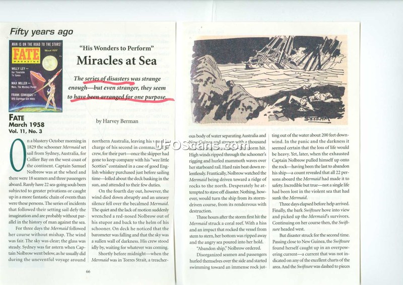 This article from the March 1958 issue of FATE Magazine recounts a series of maritime disasters occurring in 1829. The narrative begins with the schooner Mermaid, captained by Samuel Nolbrow, sailing from Sydney toward Collier Bay. After encountering a storm in the Torres Strait, the ship was wrecked on a coral reef. All 22 persons aboard survived and were rescued by the ship Swiftsure. Subsequently, the Swiftsure was wrecked near New Guinea, and the survivors were rescued by the Governor Ready. The Governor Ready then caught fire, and the survivors were rescued by the government cutter Comet. Finally, the Jupiter, which had rescued the survivors of the previous three wrecks, struck a reef and sank, leading to a rescue by the City Of Leeds. During this final voyage, an elderly passenger named Sarah Richley fell ill. The ship's physician, Dr. Thomas Sparks, discovered that the woman was searching for her son, who had joined the Royal Navy 15 years prior. Dr. Sparks realized that a seaman aboard the ship, Peter Richley, matched the description of the missing son. The doctor orchestrated a reunion between the two, which reportedly improved the mother's health, allowing her to live for nearly 20 more years.