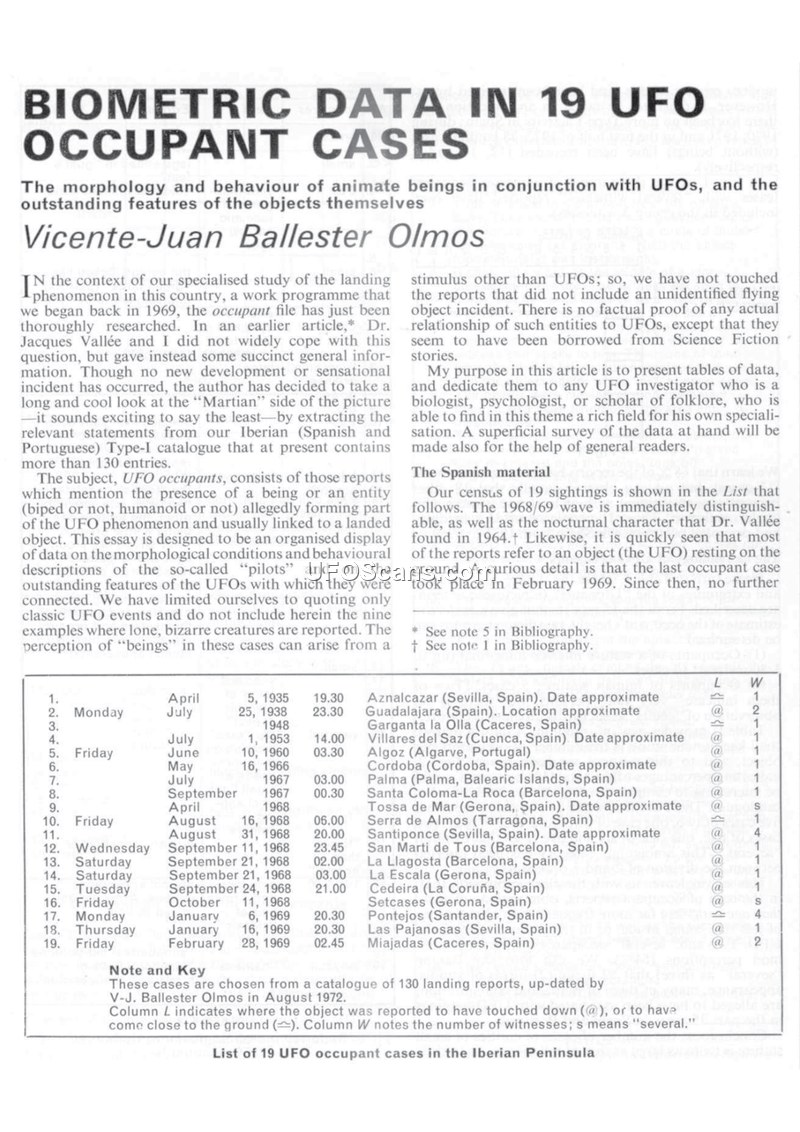 This academic article analyzes 19 UFO occupant cases in Spain and Portugal from 1935 to 1969. It concludes that there is insufficient data to form a solid morphological model of the entities.