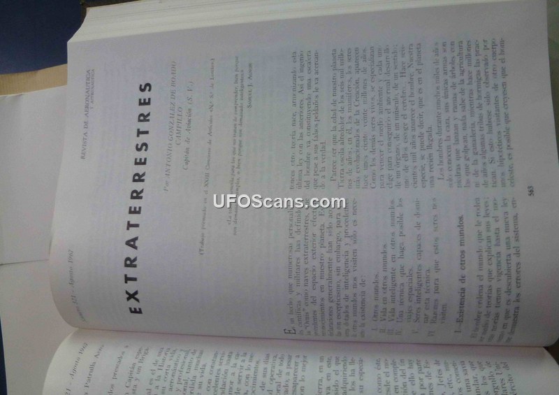 This article, published in the August 1967 issue of 'Revista de Aeronautica y Astronautica' by Captain Antonio Gonzalez de Boado Campillo, provides a comprehensive overview of the scientific and philosophical considerations regarding extraterrestrial life. The author examines the vastness of the universe, the nature of galaxies, and the conditions necessary for life as we understand it. The text discusses the potential for intelligent life elsewhere, referencing the work of scientists like Harold Urey and Doctor Ochoa, and explores the challenges of interstellar travel, including the immense distances involved and the potential for biological contamination. The author also addresses the intersection of science and religion, noting the Catholic Church's stance on the existence of other intelligent beings and the historical interpretations of biblical visions, such as those of Ezekiel. Furthermore, the article details NASA's quarantine protocols for astronauts returning from space to prevent the introduction of harmful microorganisms. The narrative concludes by reflecting on the human desire to understand our place in the cosmos and the ongoing search for extraterrestrial intelligence.