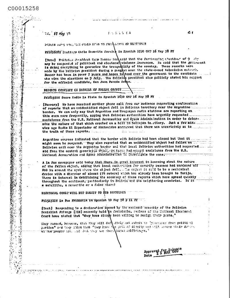 This document is a compilation of press reports dated May 17, 1978, concerning political developments in Bolivia and reports of an unidentified object falling in Bolivian territory. The first section details political statements by Bolivian President Banzer regarding upcoming elections and his support for candidate Gen Juan Pereda Asbun. The second section, titled 'REPORTS CONFLICT ON DETAILS OF FALLEN OBJECT,' summarizes information from Sucre Radio La Plata and other sources. It states that an unidentified object fell in Bolivian territory near the Argentine border. Argentine and Uruguayan radio stations reported that Bolivian authorities requested assistance from the U.S. National Aeronautics and Space Administration (NASA) to identify the object. A La Paz newspaper reported that local authorities cordoned off an area 200 kilometers around the impact site. The object is described as a mechanical device approximately 14 meters in diameter, which has been transported to Tarija. The report notes uncertainty regarding whether the object is a satellite or a false alarm. The final section mentions a declaration by the Bolivian Socialist Falange regarding the National Electoral Court.