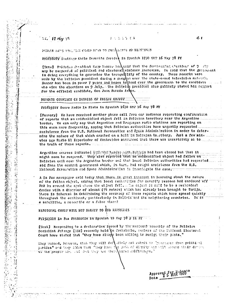 Press Compilation: Bolivia Political Situation and Unidentified Object Report, 17 May 1978