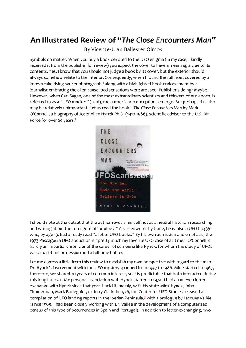 This document is a critical review of Mark O’Connell’s biography of Dr. J. Allen Hynek, written by researcher Vicente-Juan Ballester Olmos. It provides a historical overview of Hynek’s involvement with U.S. Air Force UFO projects and offers a skeptical analysis of the UFO phenomenon.