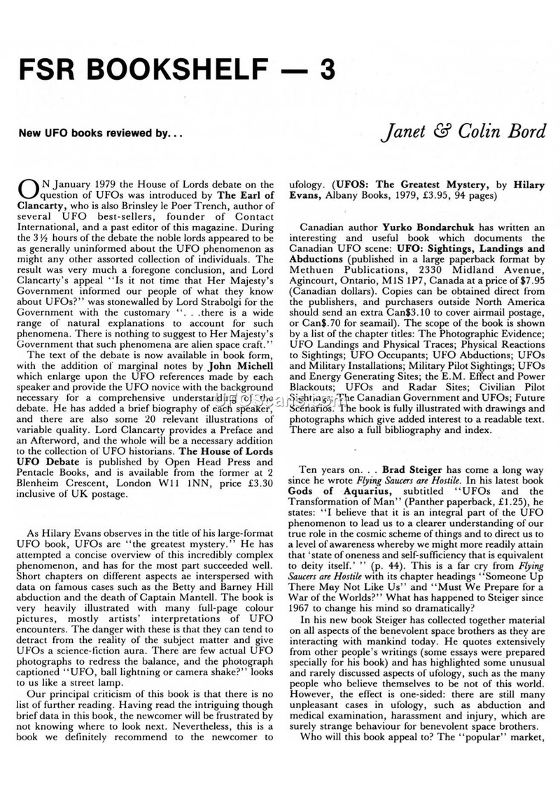 This document, titled 'FSR BOOKSHELF — 3', provides a series of reviews and discussions regarding contemporary UFO literature and theories. It begins by referencing a January 1979 House of Lords debate on UFOs, noting the involvement of The Earl of Clancarty and the subsequent publication of the debate proceedings with marginal notes by John Michell. The text reviews several books, including Hilary Evans' 'UFOs: The Greatest Mystery', Yurko Bondarchuk's 'UFO: Sightings, Landings and Abductions', and Brad Steiger's 'Gods of Aquarius'. The reviews offer critical perspectives on these works, noting strengths and weaknesses in their documentation and approach. The document also mentions the publication of children's UFO books by the editors of the Flying Saucer Review. The second part of the document features an article titled 'THE UFO "GATE" THEORY' by Dr. Bernard E. Finch. Dr. Finch, a medical practitioner and former Royal Air Force surgeon, proposes a speculative theory regarding the physical nature of UFOs. He suggests that humanoids from other dimensions possess a different atomic structure, allowing them to traverse 'gates' or points in space. He posits that these gates are influenced by the earth's rotation and gravitational fields, potentially explaining phenomena such as hauntings, telekinesis, and the sudden appearance or disappearance of objects and entities. The theory attempts to bridge the gap between ufology and other anomalous phenomena.