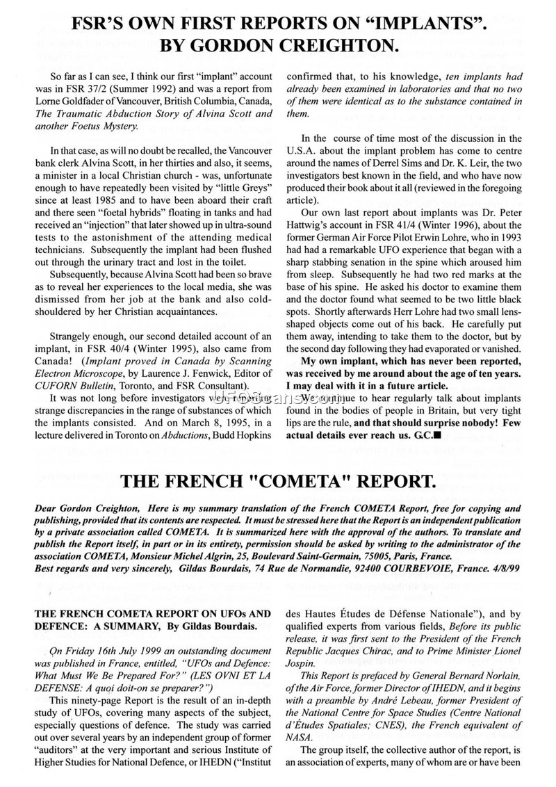 This document, published in the Flying Saucer Review (FSR), contains two primary sections: a commentary by Gordon Creighton on the subject of 'implants' and a summary of the French COMETA report. Creighton discusses historical reports of implants, citing cases involving Alvina Scott, Erwin Lohre, and his own experience. He notes that while researchers like Dr. Roger Leir have examined these objects, the phenomenon remains mysterious. The second part of the document provides a summary of the French COMETA report, titled 'UFOs and Defence: What Must We Be Prepared For?'. This report, produced by an independent group of experts and former auditors of the Institute of Higher Studies for National Defence (IHEDN), was presented to French leadership. It argues that the accumulation of well-documented UFO observations necessitates serious consideration of the extraterrestrial hypothesis. The report details the history of official French UFO research, including the creation of GEPAN and SEPRA, and examines the potential national security implications of UFOs, including the risk of 'destabilizing manipulations' and the need for 'critical vigilance.' It also touches upon the U.S. government's 'strange' attitude toward the subject since 1947. Finally, the document includes a brief report by Jorge Martín regarding a 1981 sighting in Arecibo, Puerto Rico, where a witness, Gertrudis Mendoza, encountered a metallic, round object and three beings. Creighton concludes by criticizing the COMETA report for failing to acknowledge the contributions of pioneering French UFO researchers.