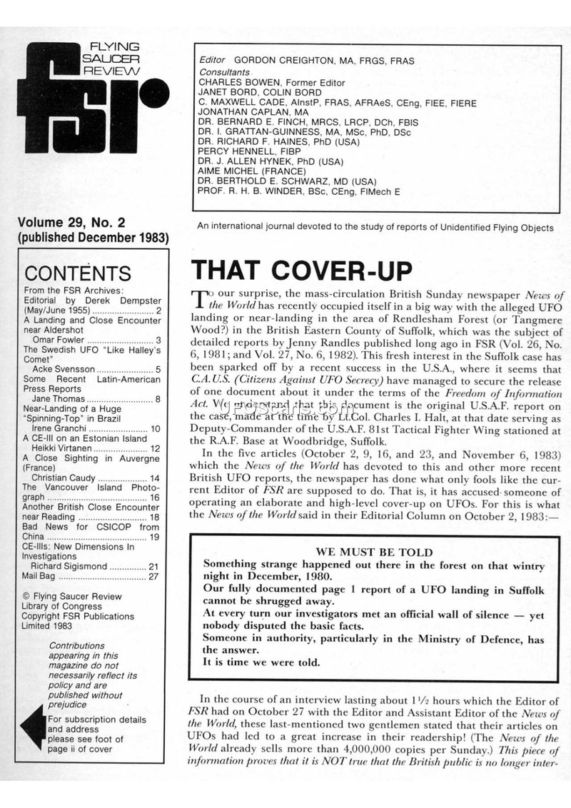This document is Volume 29, No. 2 of the Flying Saucer Review, published in December 1983. The issue focuses on the alleged cover-up of UFO sightings in the United Kingdom, with particular emphasis on the Rendlesham Forest incident. The editorial staff discusses the interest shown by the British newspaper 'News of the World' in the Rendlesham case, which involved a report by Lt. Col. Charles I. Halt of the U.S.A.F. 81st Tactical Fighter Wing. The journal asserts that the British government has historically maintained a policy of confusion regarding UFOs, citing a 1955 parliamentary exchange between Major Patrick Wall and the Under-Secretary of State for Air, George Ward. The journal also reprints an editorial from 1955, which highlights the Air Ministry's refusal to release findings on UFO reports. Additionally, the issue includes a field report by Omar Fowler, Chairman of S.I.G.A.P., regarding a sighting near Aldershot, Hampshire, on August 12, 1983. The witness, 77-year-old Alfred Burtoo, reported encountering two entities described as being over four feet tall, wearing pale green overalls and visors, while fishing on the Basingstoke Canal. The journal maintains that the public is interested in the truth about UFOs and that the 'official wall of silence' is ineffective.