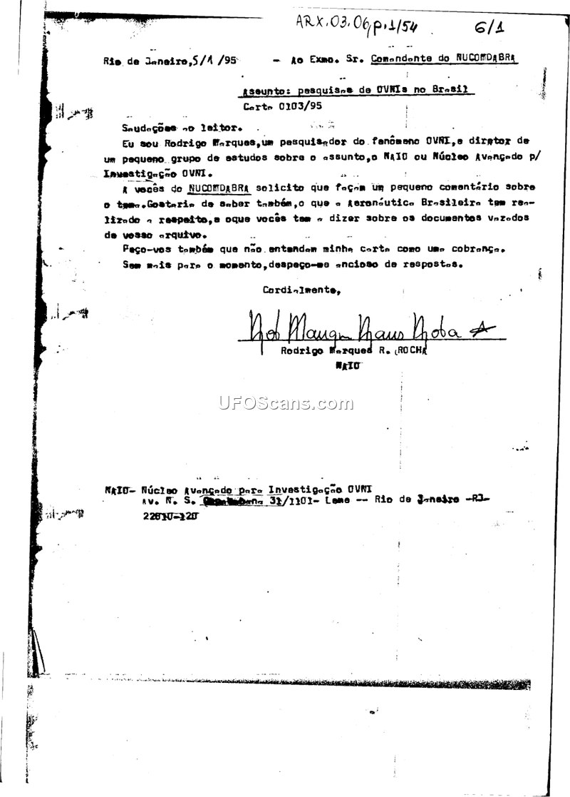 This document is a compilation of UAP sighting reports and correspondence between civilian ufology groups and the Brazilian Air Force (NUCONDABRA) from 1995. It documents the ongoing efforts of civilian researchers to obtain information from military archives regarding UAP incidents in Brazil.