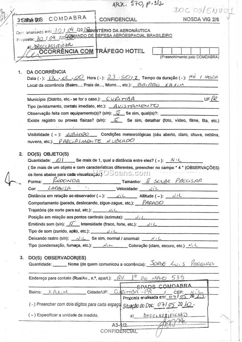 This document is a confidential sighting report filed with the Brazilian Aerospace Defense Command (COMDABRA) regarding an incident that occurred on January 13, 2000, in the Xaxim neighborhood of Curitiba, Paraná. The witness, Jorge Luis Pereira, reported observing a single, round, orange-colored object that remained stationary for approximately one hour. The weather conditions at the time were described as partially cloudy. The witness stated that he did not possess technical knowledge regarding Unidentified Aerial Phenomena (UFOs) and was not affiliated with any research organizations. Notably, the report includes a remark in the observations section indicating that the witness reported other residents of the street were also observing the object. The report was received by an individual identified as ZS Echevarria at CINDACTA II on the same date as the sighting. The document is marked as declassified.