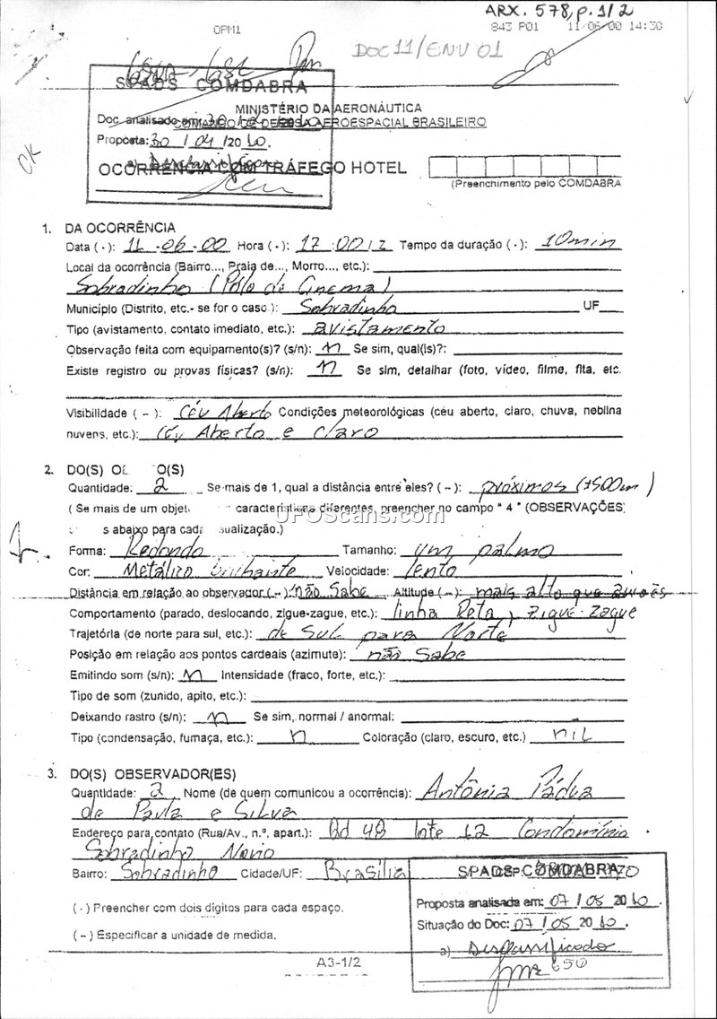 A sighting report from June 11, 2000, in Sobradinho, Brazil, involving two round, metallic, slow-moving objects observed by a teacher. The report was processed by the Brazilian military (COMDABRA/CINDACTA I).