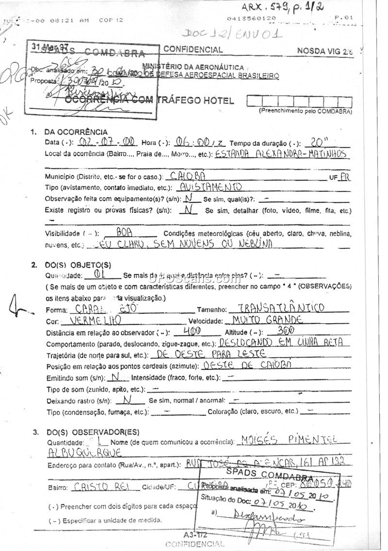 A dermatologist reported a large, crab-shaped, red-light-emitting object in Caiobá, Brazil, on July 2, 2000. The military investigation found the witness to be credible and lucid.