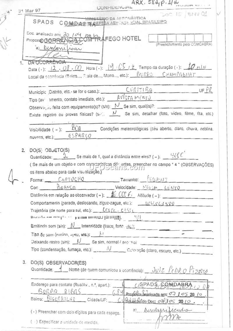 This document is a formal sighting report filed with the Brazilian Ministry of Aeronautics, specifically the Aerospace Defense Command (COMDABRA). The incident occurred on August 12, 2000, at 19:05 in the Champagnat neighborhood of Curitiba, Paraná. The witness, identified as Judge Pedro Pizzato, reported observing two small, white, cartridge-shaped objects moving slowly at an estimated altitude of 10,000 feet. The objects were traveling in an east-to-east trajectory. The duration of the sighting was approximately 10 minutes. The report indicates that there was no sound, no physical evidence, and no equipment used to observe the objects. The visibility was described as good with sparse clouds. The report was received by 2S Henrique at CINDACTA 2 on the same day as the incident. The document itself bears a date of March 31, 1997, which appears to be a form template date or administrative reference, as the incident date is recorded as August 2000.