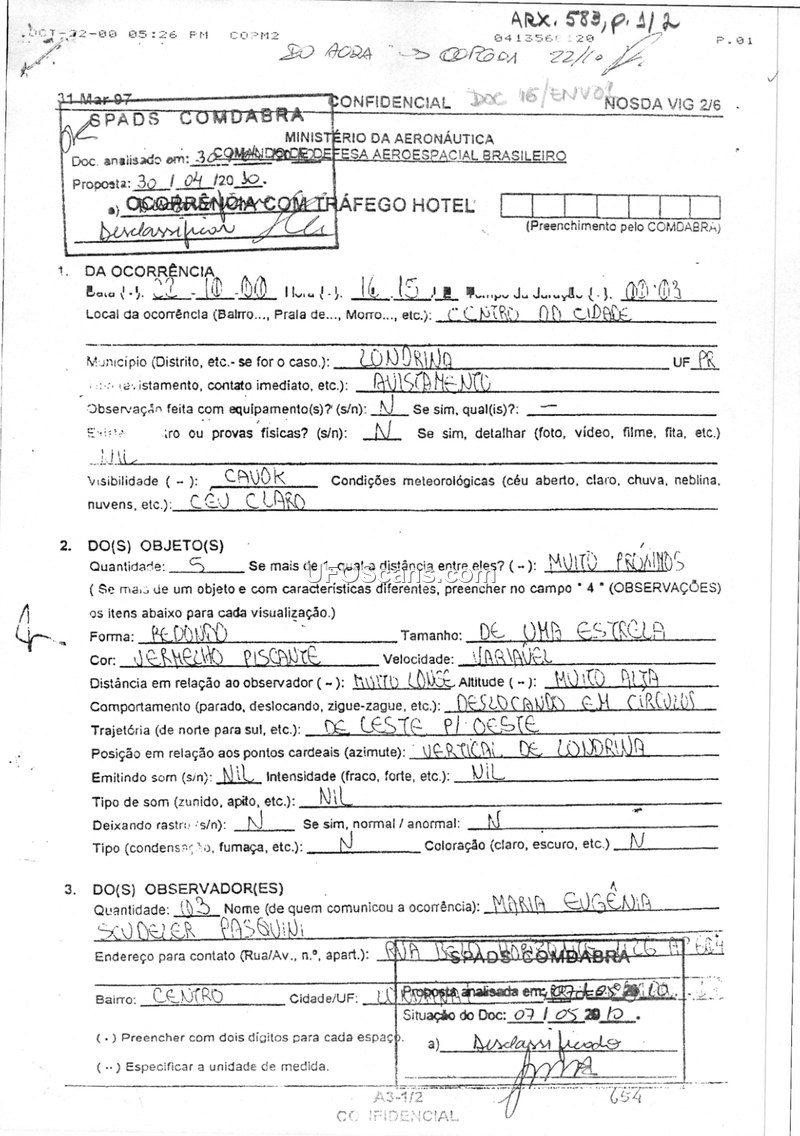 This document is an official sighting report filed with the Brazilian Aerospace Defense Command (COMDABRA) regarding an event that occurred on October 22, 2000, in the city of Londrina, Paraná. The witness, Maria Eugênia Scudeler Pasquini, reported observing five objects at 16:15 hours. The objects were described as round, flashing red, and appearing similar in size to a star. The witness noted that the objects were moving in circles, traveling from east to west, and were at a very high altitude. The report indicates that there was no equipment used to observe the objects, no physical evidence was collected, and no radar contact was made. The weather conditions were reported as clear skies. The report was received by a military official identified as 2S Abreu at 20:00 hours on the same day. The document is marked as confidential and was later declassified.