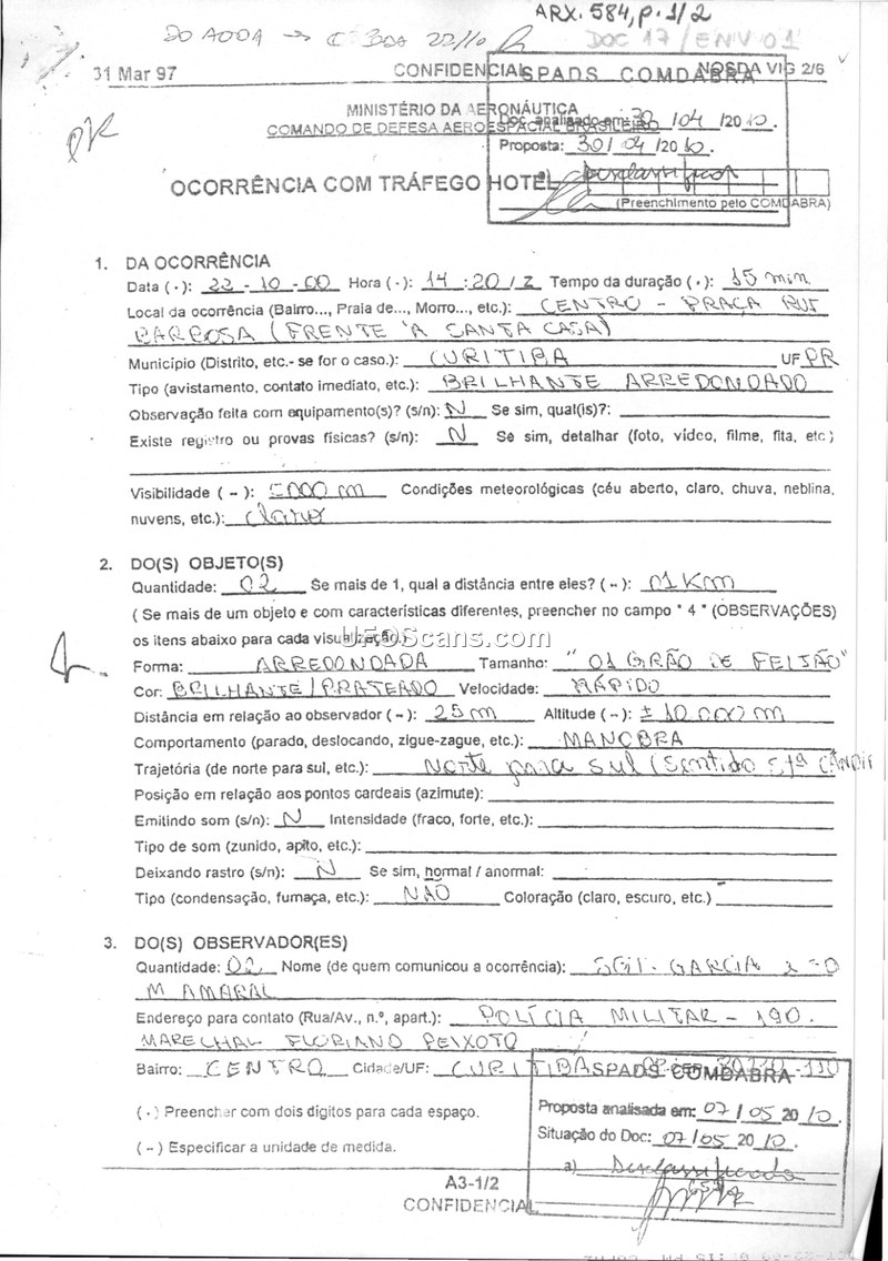 This document is a confidential occurrence report filed with the Brazilian Air Force's Aerospace Defense Command (COMDABRA) regarding an aerial sighting on October 22, 2000. The incident occurred at 14:20 Z in the vicinity of Praça Rui Barbosa in Curitiba, Paraná. Two witnesses, identified as Sgt. Garcia and M. Amaral of the Military Police, reported observing two bright, silver, rounded objects. The objects were described as being the size of a 'bean grain' and were observed performing maneuvers while traveling from north to south at an estimated altitude of 10,000 meters. The sighting lasted approximately 15 minutes under clear weather conditions. A secondary witness, Emerson Rodrigues de Souza, who holds a degree in anthropology, was also noted as having observed the objects. The report was received by Sgt. Gildiley at CINDACTA-II. No physical evidence, radar contact, or photographic documentation was recorded in relation to the event.