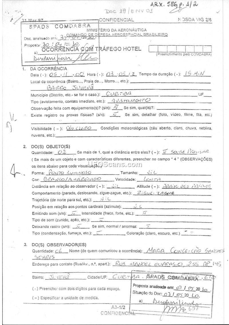 A military report detailing a 15-minute sighting of two luminous, slow-moving objects in Curitiba, Brazil, on November 5, 2000. The objects exhibited zigzag movement and were observed by a family at low altitude.