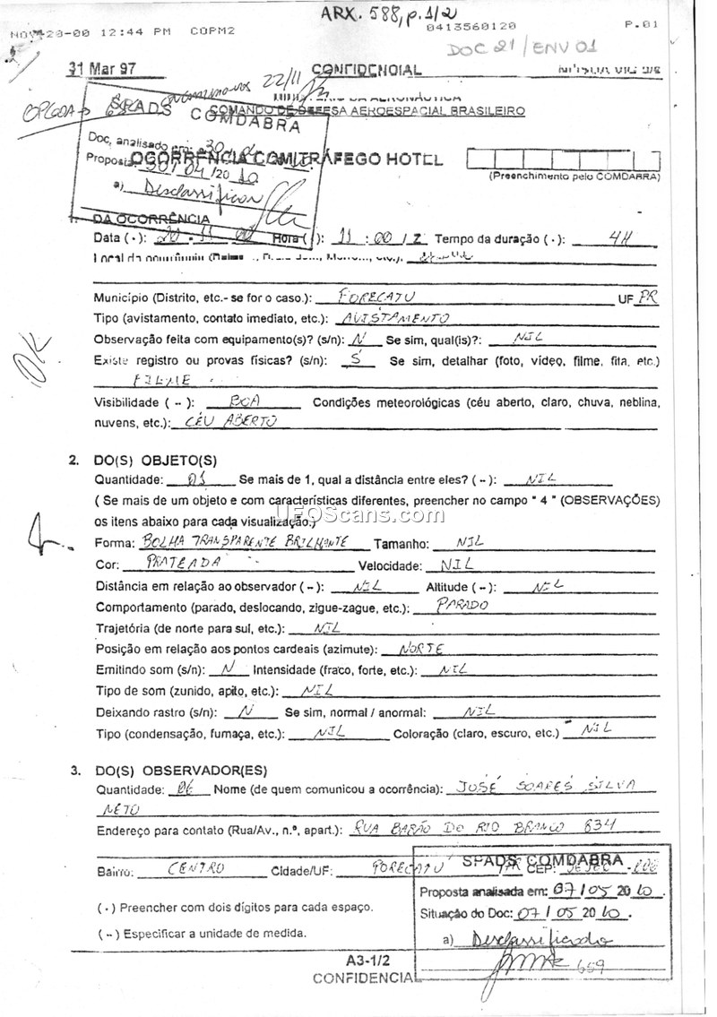 A 1997 Brazilian military report detailing a four-hour sighting of a stationary, silver, transparent object in Porecatu, PR, supported by radar data and potential photographic evidence.