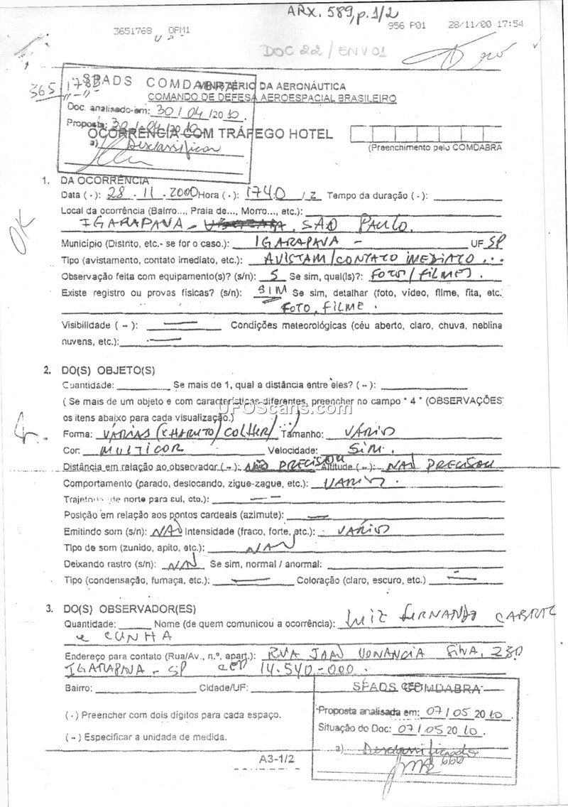This document is a sighting report filed with the Brazilian Aerospace Defense Command (COMDABRA) regarding an event on November 28, 2000, in Igarapava, São Paulo. The witness, Luiz Fernando Cabral e Cunha, reported an encounter involving multiple objects described as having various shapes, including 'cigar' and 'spoon' forms, and being 'multicolored.' The witness claimed to have photographic and film evidence of the event. The report notes that the witness has a long history of sightings spanning approximately eight years and has previously attempted to contact various researchers and organizations, though he expressed dissatisfaction with the lack of receptivity or adequate responses he received. The witness explicitly requested that his name not be made public and that there be no sensationalism regarding his report. The document was processed by COMDABRA in May 2010.