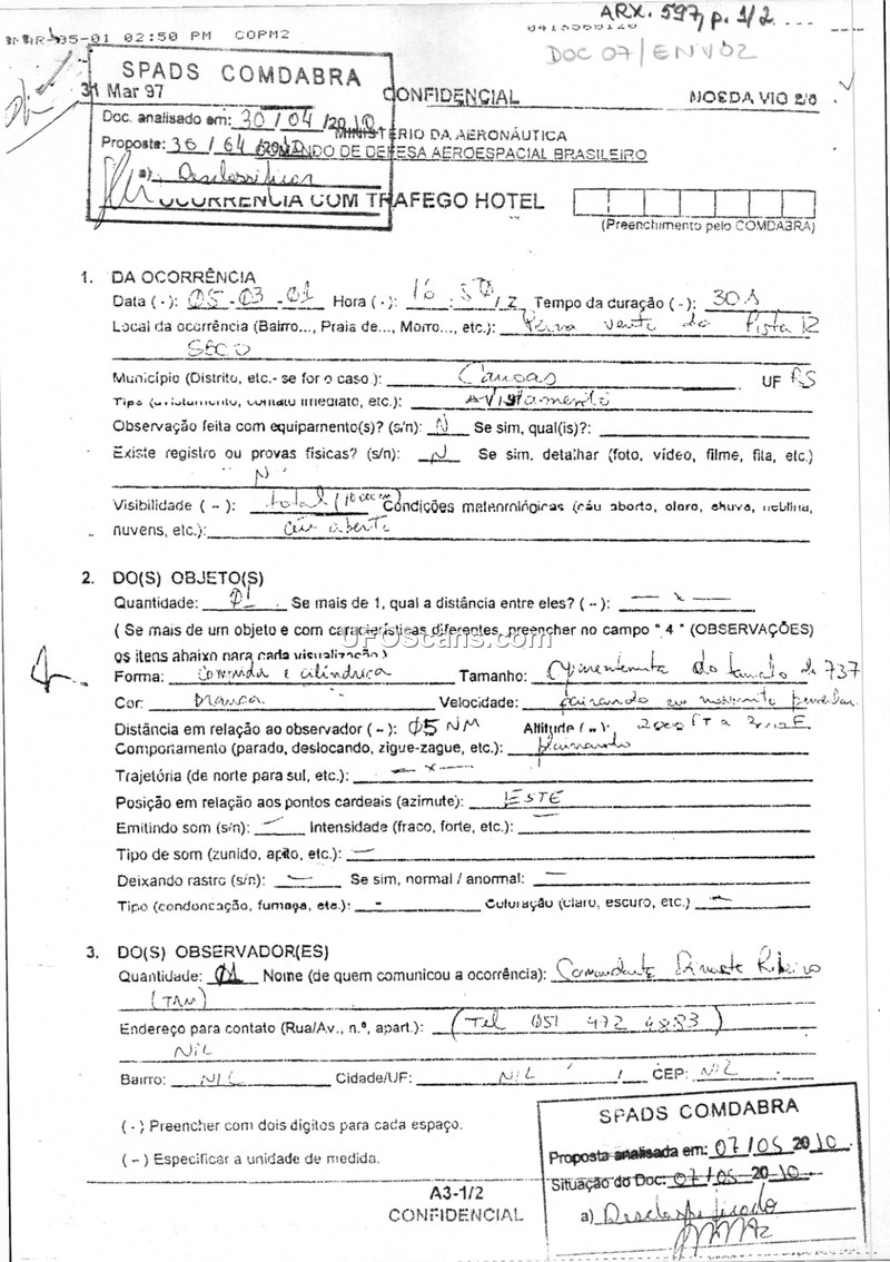 This document is a formal sighting report filed with the Brazilian Aerospace Defense Command (COMDABRA) regarding an unidentified aerial phenomenon observed on March 5, 2001. The witness, a TAM airline pilot named Comandante Dineste Ribeiro, reported observing a single, white, cylindrical object at approximately 16:50 Z. The object was estimated to be similar in size to a Boeing 737 and was observed at an altitude of 2,000 feet near the runway 12 area in Canoas, Rio Grande do Sul. The duration of the sighting was 30 seconds. The report indicates that there were no physical traces, radar contacts, or photographic evidence associated with the event. The witness, who holds a professional pilot license, provided contact information and noted that he felt compelled to report the sighting due to its clarity and his professional affiliation with TAM. The document includes administrative markings from COMDABRA, including a classification of 'CONFIDENCIAL' and a document reference number ARX. 597.