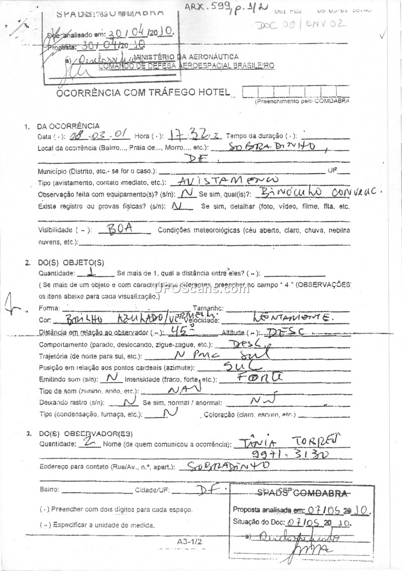 This document is a formal sighting report filed with the Brazilian Aerospace Defense Command (COMDABRA) regarding an unidentified aerial phenomenon observed on March 8, 2001, in Sobradinho, Federal District, Brazil. The witness, identified as Tânia Torret, a physician, reported observing a single object at 17:32. The object was described as having a bluish/red color and was observed moving slowly in a trajectory from north to south while descending. The witness indicated that the observation was made without the use of equipment, although the form contains a note regarding binoculars. The report confirms that no physical evidence, photographs, or film were obtained, and there was no radar contact. The weather conditions at the time were reported as good with a clear sky. The report was received by an individual named Petronio at COMDABRA.