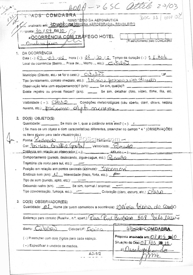 This document is a sighting report filed with the Brazilian Ministry of Aeronautics (COMDABRA) regarding an unidentified aerial phenomenon observed in Catalão, Goiás, on March 3, 2001. The witness, Olívia Vieira do Compo, reported observing a round, bright object for approximately one hour and thirty minutes. The report indicates that the sky was clear at the time of the sighting. The object was described as moving, though the report also contains conflicting or ambiguous notes regarding its speed and behavior. No physical evidence, radar contact, or photographic documentation was recorded. The document includes administrative markings from COMDABRA, including a proposal analysis date of May 7, 2010. The report is marked as 'CONFIDENCIAL' and includes the witness's contact information, though some details remain illegible due to the quality of the scan.