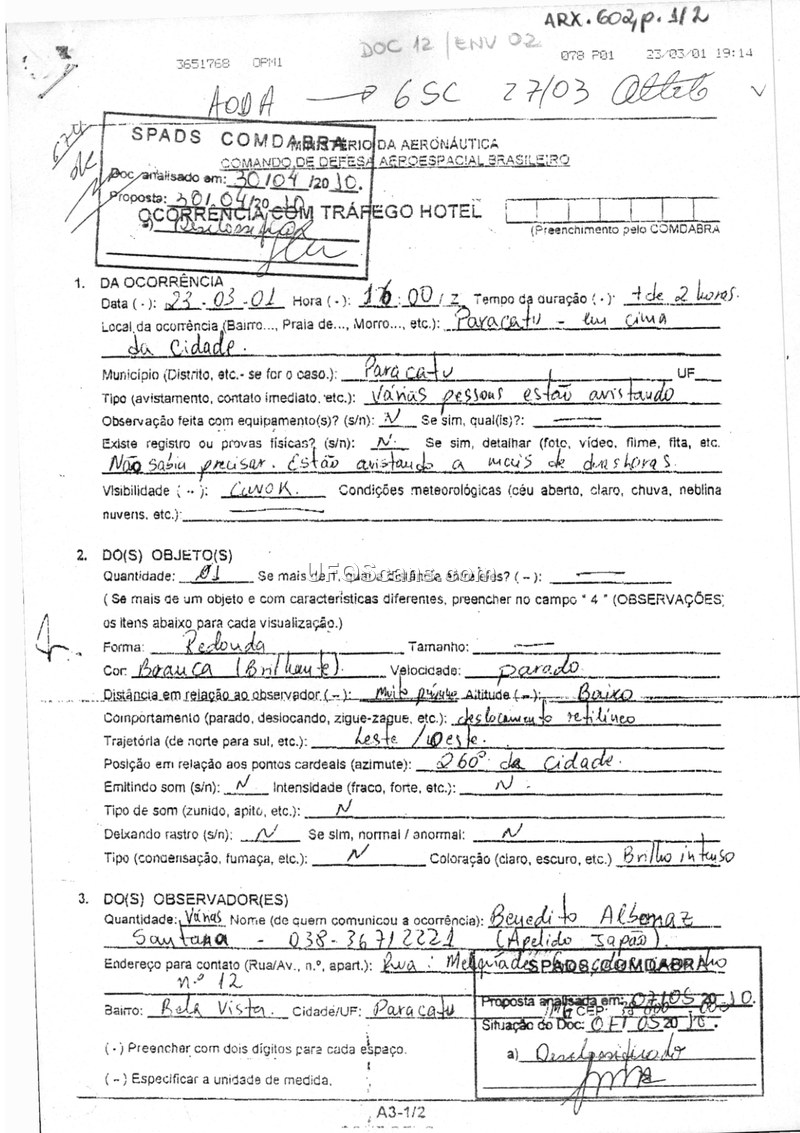 A sighting report from Paracatu, Brazil, dated March 23, 2001, describes a stationary, bright white, round object observed for over two hours. The event was widely reported by local radio, though no physical or radar evidence was collected.
