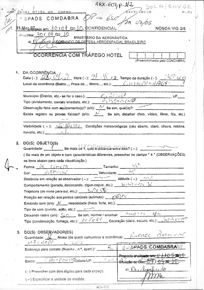 A confidential Brazilian military report detailing a 30-second sighting of a red, comet-shaped object with an abnormal trail on April 28, 2001. The report was filed with COMDABRA and contains no evidence of physical traces or radar confirmation.