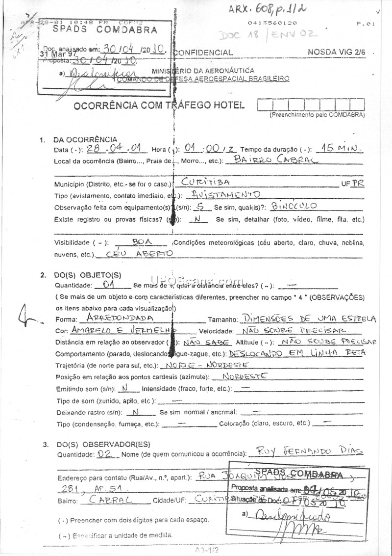 This document is a formal sighting report filed with the Brazilian Aerospace Defense Command (COMDABRA) regarding an unidentified aerial phenomenon observed on April 28, 2001, in the Bairro Cabral district of Curitiba, Brazil. The primary witness, a 44-year-old civil engineer named Roy Fernando Dias, reported observing a single, rounded object that appeared to be the size of a star. The object was described as yellow and red in color and was observed moving in a straight line toward the North-Northeast. The witness noted that the object was rotating on its own axis. The sighting lasted approximately 15 minutes and was observed by both the primary witness and his wife, with the aid of binoculars. The report confirms that the sky was clear at the time of the observation. The incident was formally communicated to the military organization CINDACTA 2 on April 29, 2001, by 3S Noronha.
