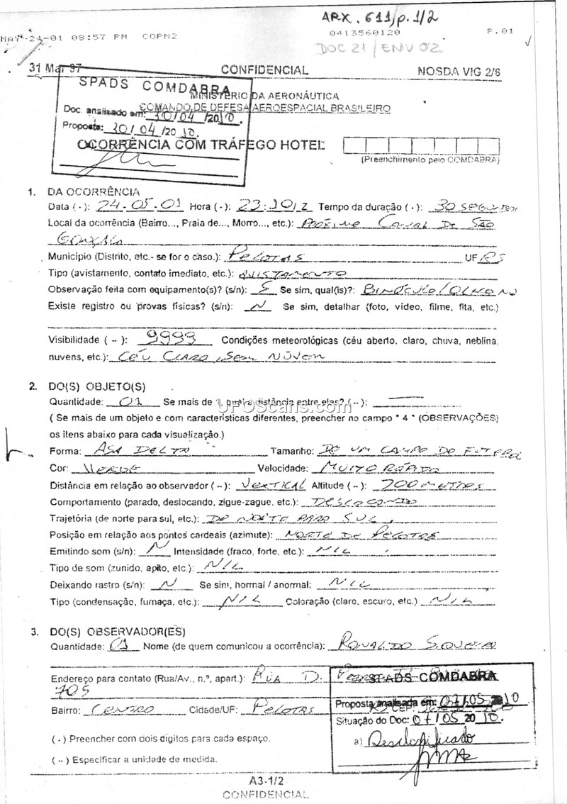 This document is a formal sighting report filed with the Brazilian Aerospace Defense Command (COMDABRA) regarding an unidentified aerial phenomenon observed on May 24, 2001, in Pelotas, Rio Grande do Sul. The witness, Ronaldo Souza, reported observing a single object shaped like a delta wing, colored green, and estimated to be the size of a soccer field. The object was observed at an altitude of approximately 700 meters, moving at a very high speed from north to south. The observation lasted for 30 seconds under clear, cloudless weather conditions. The witness used binoculars to aid the observation. The report notes that the witness had previously reported another sighting in November 1999. The communication was received by a military official, 2S S. Teixeira, on May 24, 2001. The document is marked as confidential and includes administrative details regarding the processing of the report by COMDABRA.