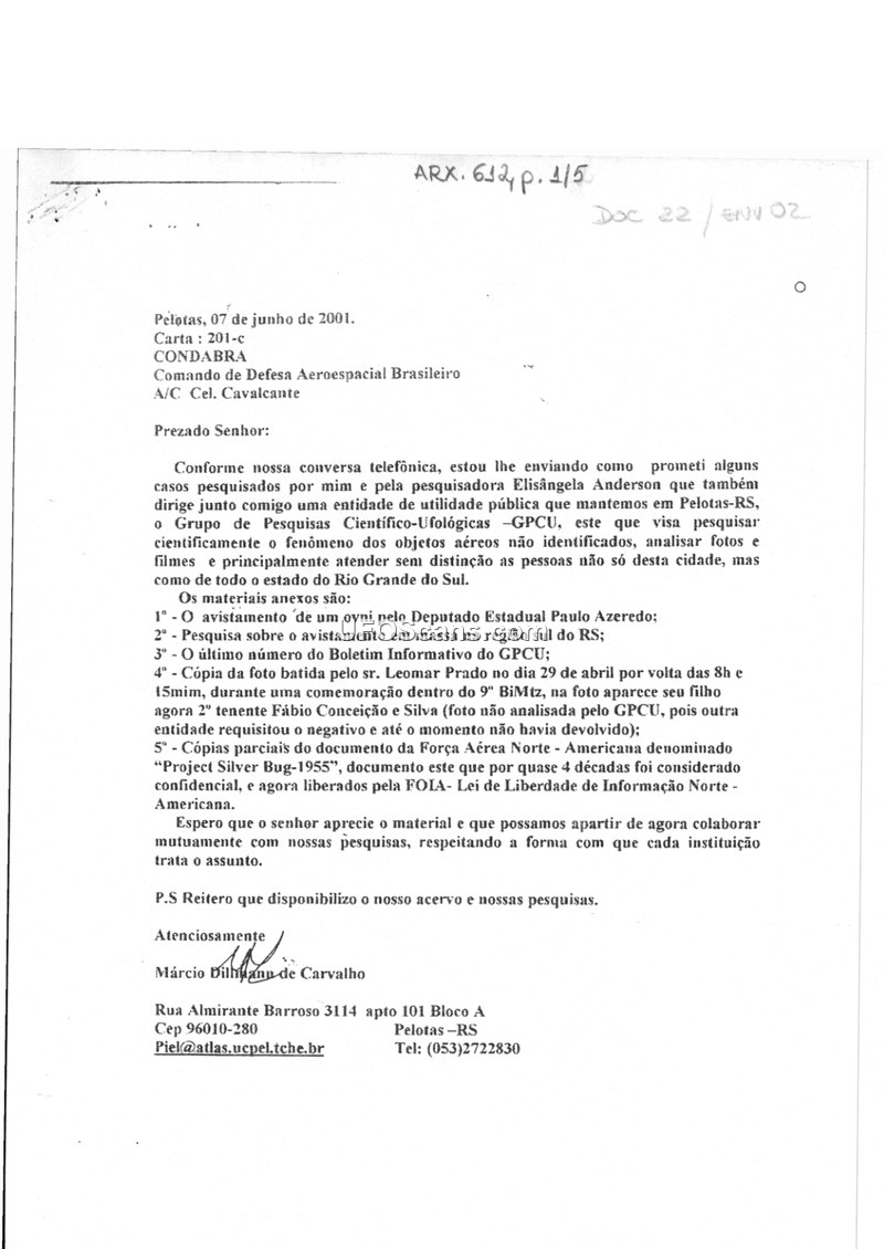 This document is a letter dated June 7, 2001, from Márcio Dillmann de Carvalho of the Grupo de Pesquisas Científico-Ufológicas (GPCU) to the Comando de Defesa Aeroespacial Brasileiro (CONDABRA). The author, writing to Colonel Cavalcante, provides a collection of research materials regarding Unidentified Aerial Phenomena (UAP) sightings in the state of Rio Grande do Sul, Brazil. The correspondence serves as an introduction to several enclosed reports, including a sighting by State Deputy Paulo Azeredo on December 28, 2000, while traveling on the BR 293 highway. Azeredo reported observing three yellowish lights, followed by a bright bluish-white object that appeared to hover near trees and later followed his vehicle. The document also details a wave of sightings in November 2000 across municipalities such as Pelotas, Rio Grande, Pedro Osório, Piratini, and Canguçu. These reports describe various phenomena, including objects in formation, circular and diamond-shaped craft, and instances of physical interference in residences. The author emphasizes the scientific approach of the GPCU and expresses a desire for mutual collaboration with the military command. Additionally, the document includes a copy of a photograph taken by Leomar Prado on April 29, 2001, and partial documentation regarding the U.S. 'Project Silver Bug-1955', which had recently been released under the Freedom of Information Act (FOIA). The author concludes by reiterating the availability of the GPCU's archives for further study.