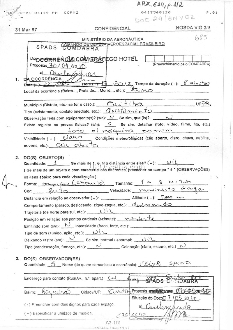 A sighting report from 2001 detailing a cigar-shaped object observed over Curitiba, Brazil. The report includes witness details, object characteristics, and notes that a photograph was taken.
