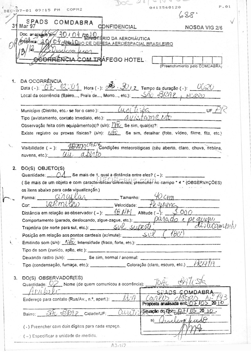 This document is a confidential sighting report filed with the Brazilian Ministry of Aeronautics and the Aerospace Defense Command (COMDA8RA). The incident occurred on December 1, 1997, at 23:05 in the São Braz area of Curitiba, Paraná. The witness, João Batista, a 47-year-old former student of the Aero Club Aviation School, reported observing a single circular object. The object was described as red in color, approximately 40 centimeters in size, and situated at an altitude of 5,000 units. The object remained stationary with minor movements, following a southern trajectory (180 degrees). The weather was reported as clear. The report notes that the witness had some knowledge of UFO literature but was not affiliated with any study organizations. The report was received by a Third Sergeant named Marcelo at COMDA8RA.
