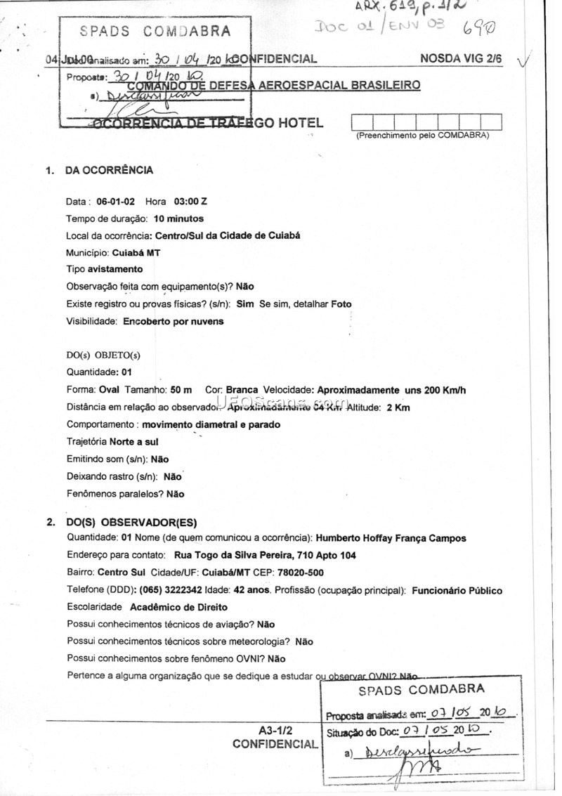 A formal military report documenting a 10-minute sighting of a 50-meter oval object over Cuiabá, Brazil, on January 6, 2002. The witness provided two photographs as evidence of the event.
