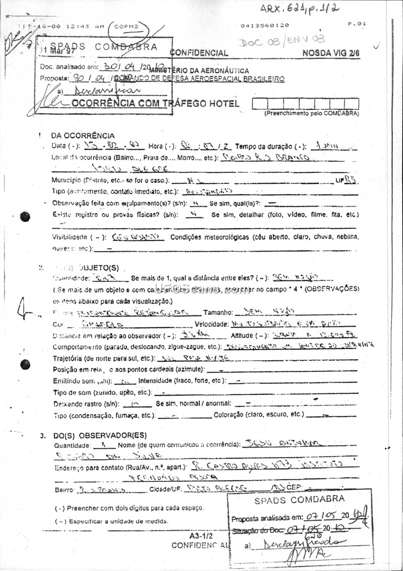 A 1997 Brazilian military report detailing a one-minute sighting of a yellow, rectangular object moving in a zigzag pattern at 12,000 feet.
