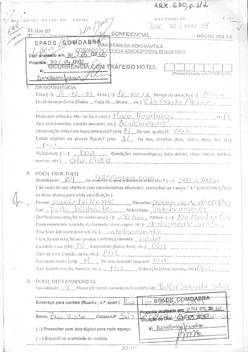 This document is a declassified military report from the Brazilian Ministry of Aeronautics, specifically the Aerospace Defense Command (COMDABRA), regarding an Unidentified Aerial Phenomena (UAP) sighting. The incident occurred on December 28, 2002, in Vila Santo Afonso, Novo Hamburgo, Rio Grande do Sul. The witness, João Corda Silva, reported observing four bright objects at an altitude of 10 to 15 meters. The objects exhibited erratic behavior, described as separating rapidly and then approaching each other as if to touch, before moving away again. The witness compared their movement to that of skydivers performing maneuvers without opening their parachutes. The report notes that the weather was clear and that no radar contact, physical evidence, or photographic documentation was obtained. The report was processed by SPADS COMDABRA and includes testimony from three additional witnesses: Pedro Nelson Petres (father), Suaci de Lima (mother), and Janice Homem da Silva (spouse). The document was officially received by 2S Cristian at COPM 2 on December 16, 2002.