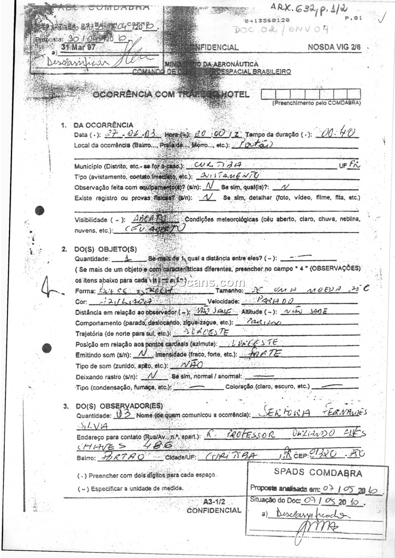 A 1997 Brazilian military report detailing a 40-minute sighting of a stationary, bluish, star-shaped object in Curitiba. The report was processed by COMDABRA and contains witness contact information and object characteristics.