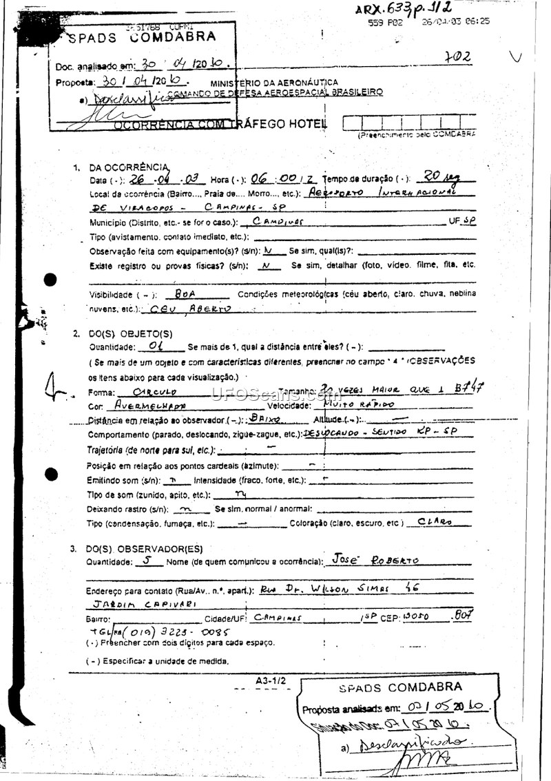 This document is a formal sighting report filed with the Brazilian Aerospace Defense Command (COMDABRA) regarding an unidentified aerial phenomenon observed on April 26, 2003. The witness, José Roberto, reported observing a single circular, reddish object near Viracopos International Airport in Campinas, São Paulo. The sighting lasted approximately 20 seconds under clear weather conditions. The witness estimated the object's size to be 20 times larger than a Boeing 747 and described its movement as very fast, traveling in a direction identified as KP to SP. The report notes that there were no physical traces, photographic evidence, or radar contacts associated with the event. The communication was received by a military official identified as 3S Adão at COMDABRA. The document is marked as confidential and was later declassified.